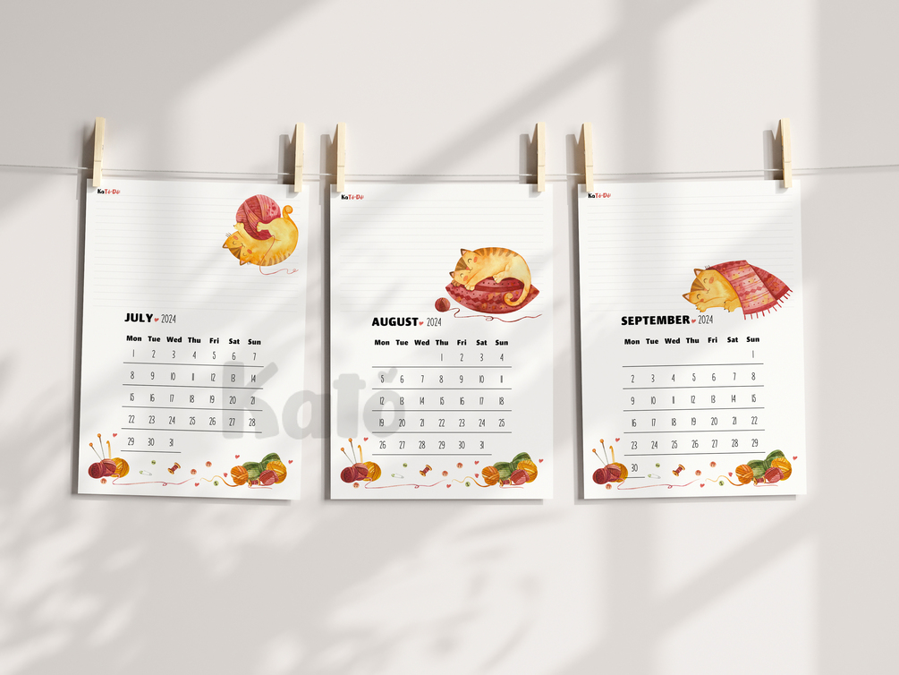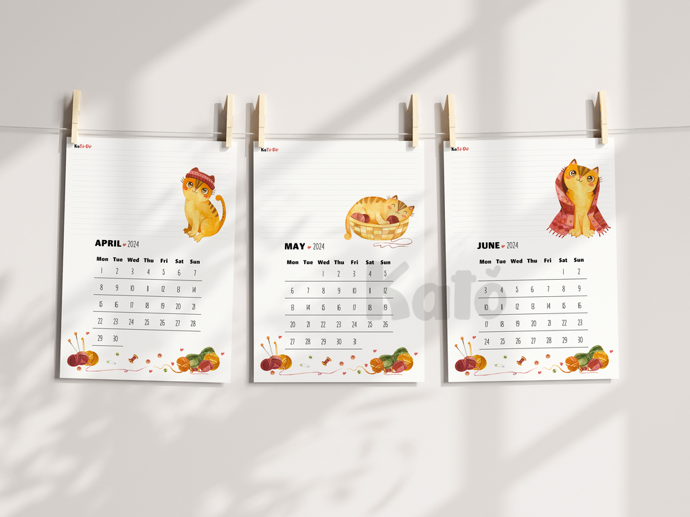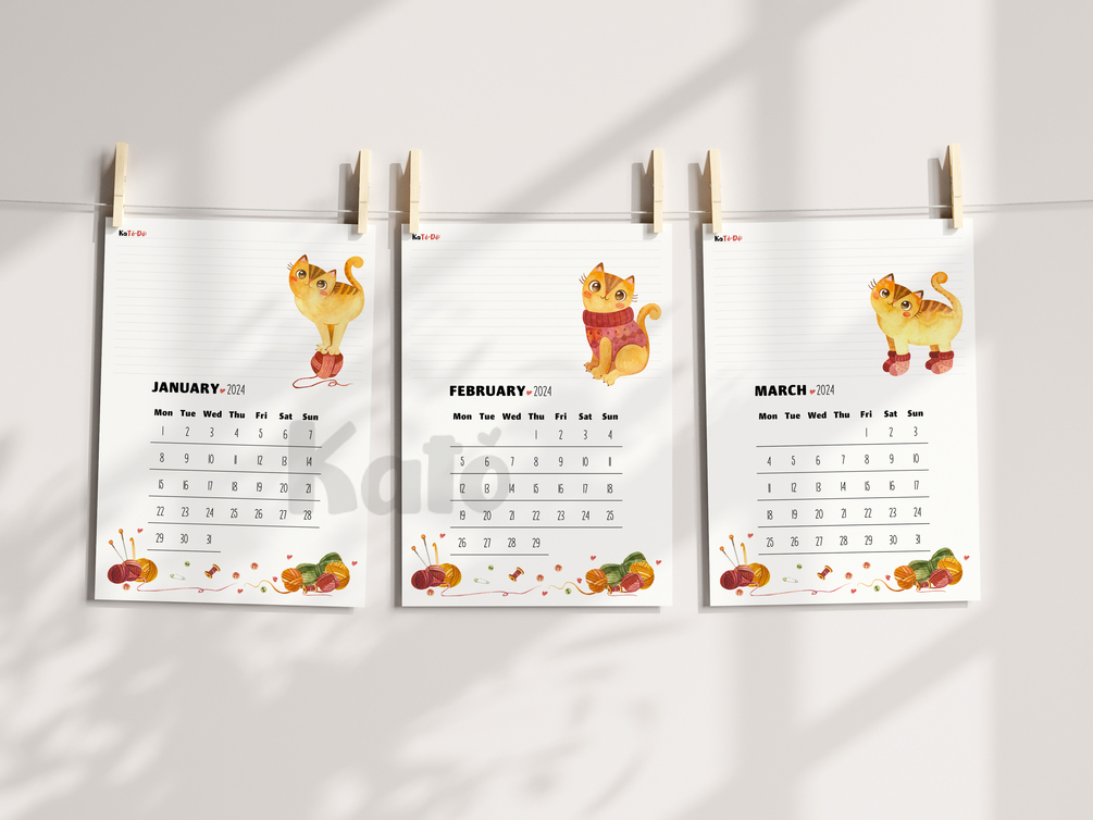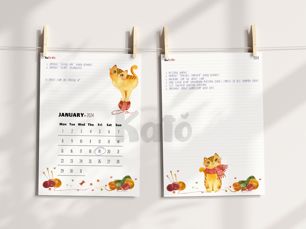 Every calendar page has a notes section in its top portion. With this feature, the calendar is intended to be a cute and handy workshop or office decor for yarn crafters, or any crafter who loves yarns and cats as a theme.