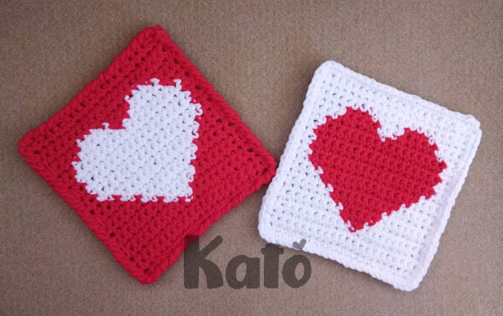 This is a digital pattern for a crochet square with a heart motif. The crochet square can serve as a drink coaster, but multiple instances of it can be joined and used to create a pot holder, blanket, wrap etc.
