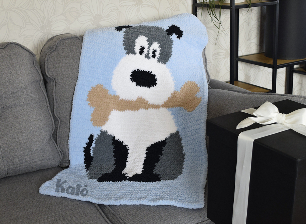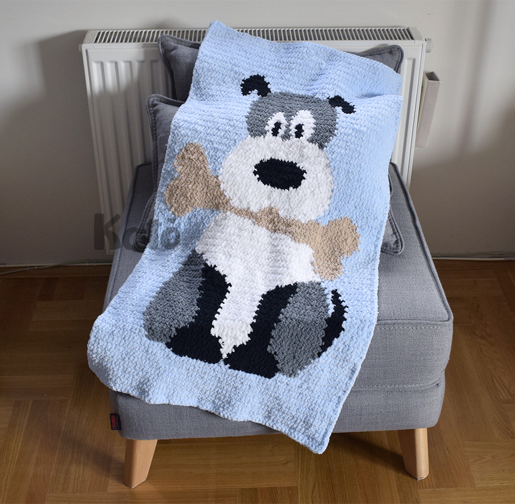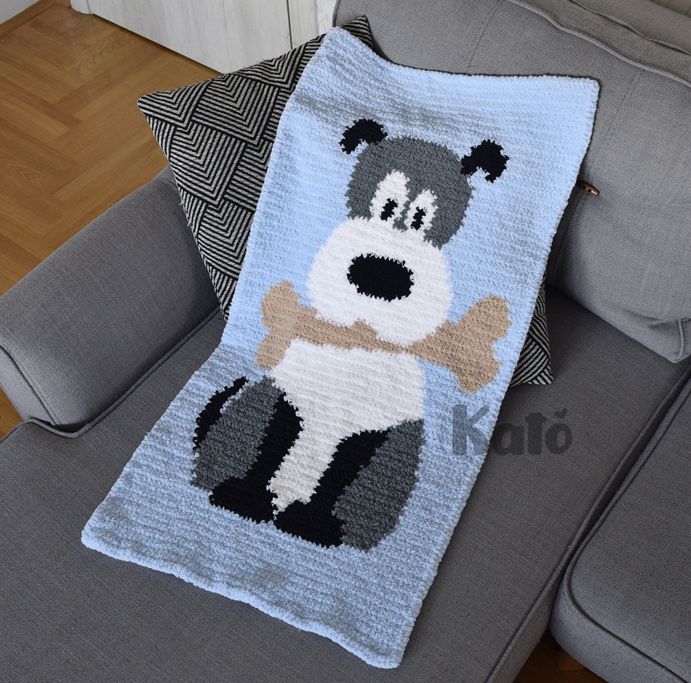 This is a digital crochet pattern for a stroller baby blanket with a puppy dog motif.