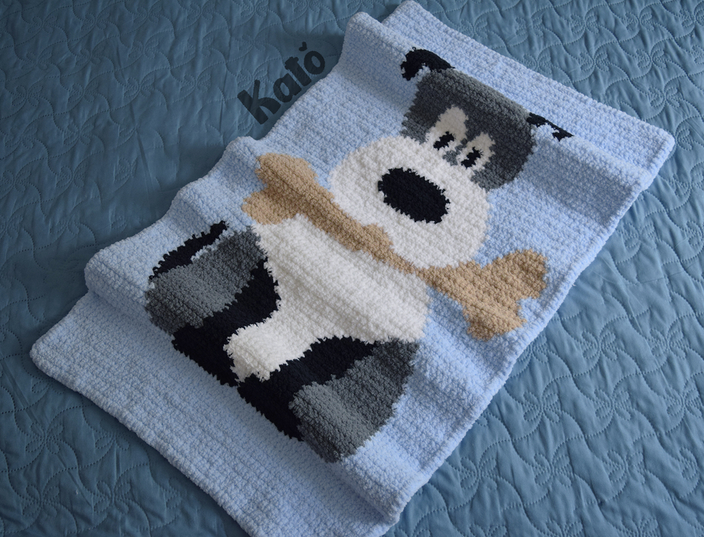 This is a digital crochet pattern for a stroller baby blanket with a puppy dog motif.